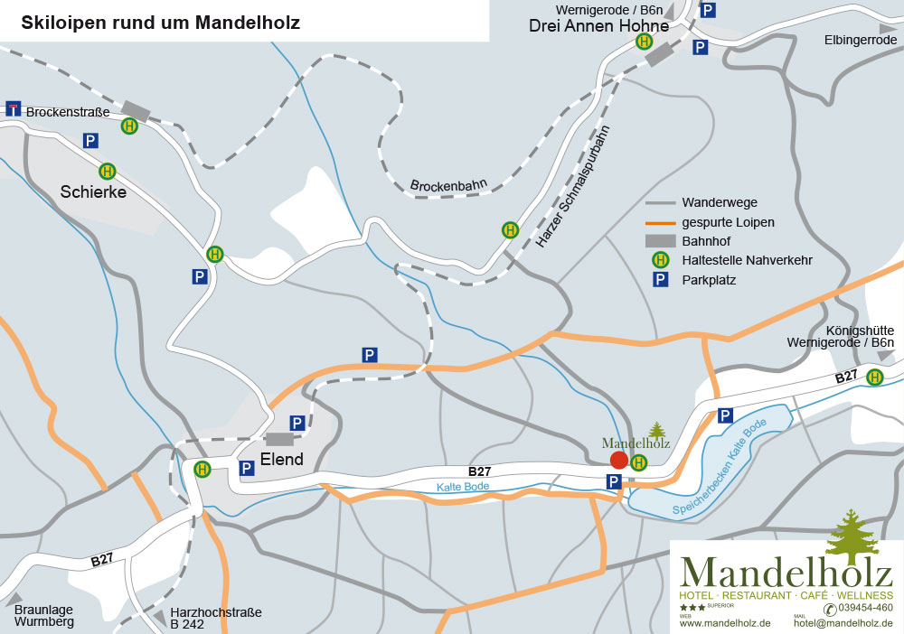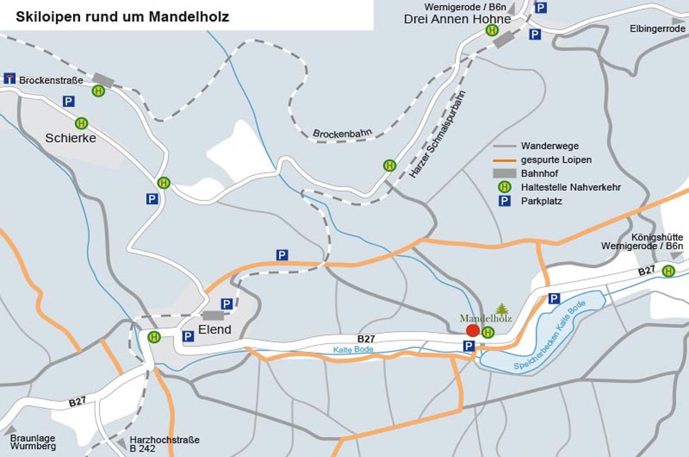 Je nach Schneelage ziehen sich ca. 60 km gespurte Loipen rund um den Brocken, Schierke, Braunlage und Elend. Zwei führen direkt an mandelholz vorbei und ermöglichen so den Einstieg in das Loipennetz.